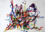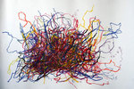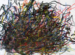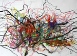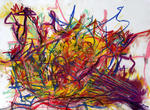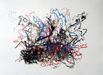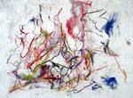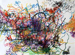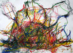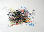 Om mijn handschrift verder te ontwikkelen heb ik in 2007 een periode voornamelijk met lijnen gewerkt. De lijn maakt het makkelijker de hand vrij over het papier te bewegen en brengt mij dichter bij mijn intuitieve beweging. Waar lijnen zich samenvoegen ontstaan kleurvlakken, maar deze zijn in hun ontstaansproces vrijer geworden.