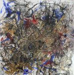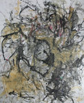 Deze grote werken op 400 gram papier groeien in mijn atelier. Het papier ligt op de vloer en tijdens het werken beweeg ik me over en in het werk. De sporen die zo ontstaan zijn het werk, het tekenen en schilderen is het maken van sporen in sporen.